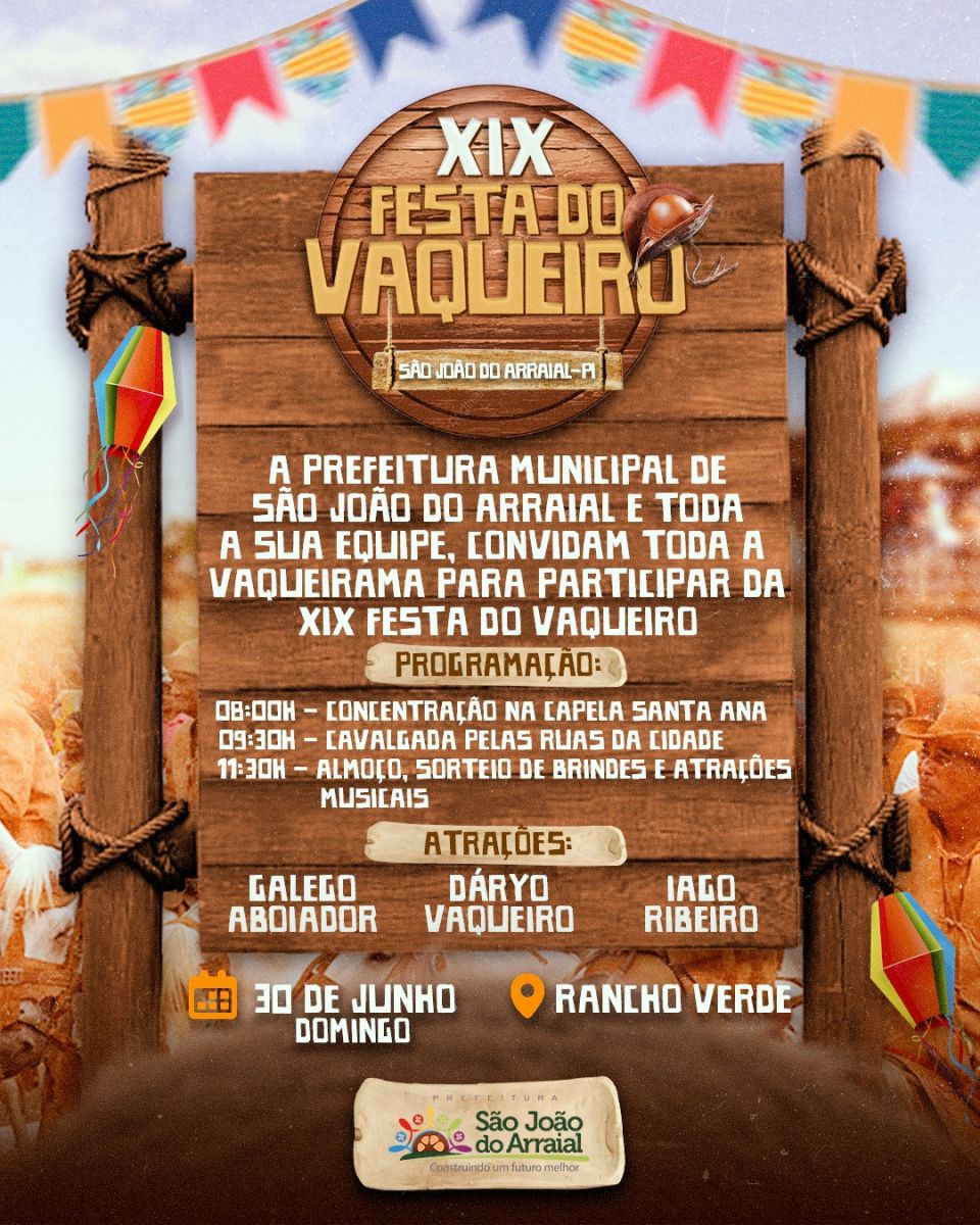 No domingo dia 30 haverá também a tradicional festa do vaqueiro que promete reunir mais de 500 vaqueiros da região em uma grande festa no Clube Rancho Verde que será animado por Galego Aboiador, Dário Vaqueiro e Iago Ribeiro.
