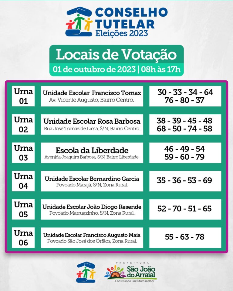 A Secretaria Municipal de Assistência Social e o Conselho Municipal dos Direitos da Criança e do Adolescente – CMDCA, divulgou os locais de votação para escolha dos novos mebmros do conselho tutelar de São João do Arraial.